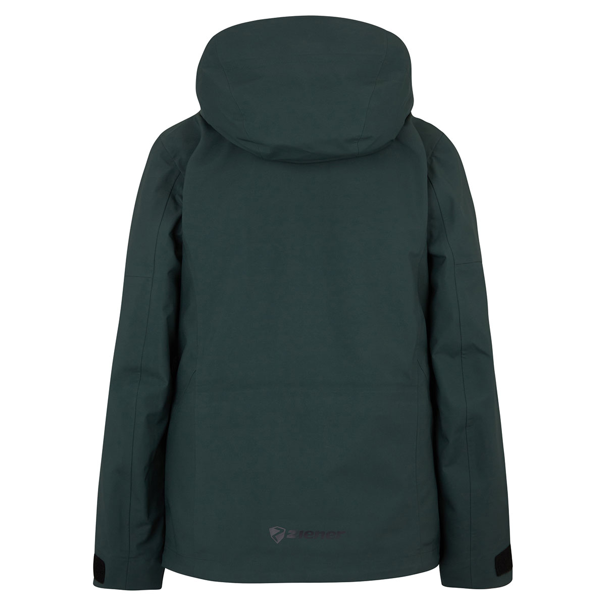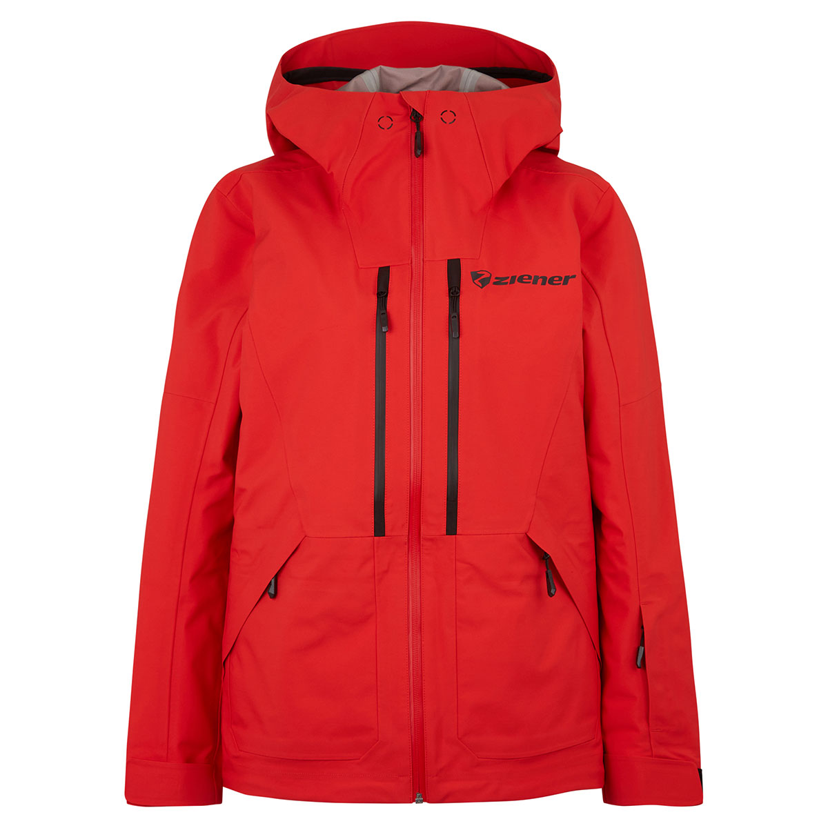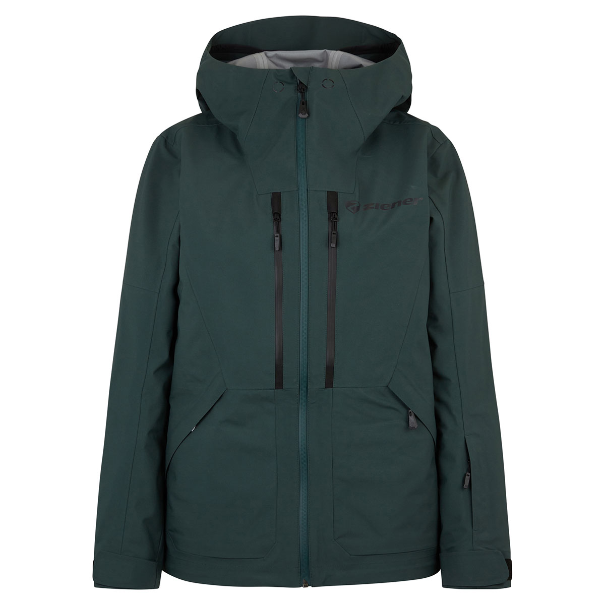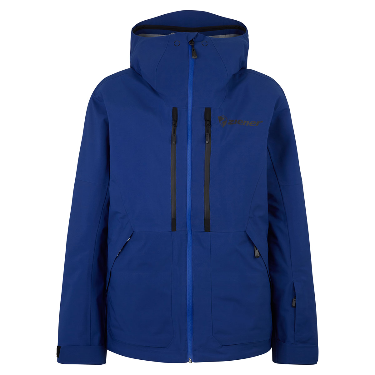 The highly functional, unwaterproof ZIENER TEAMWEAR TANKO-Z MAN ski jacket is equipped with the breathable, windproof, and waterproof Dermizax® membrane (water column 20,000 mm/breathability 10,000 g/m²/24h). The 3-layer DERMIZAS fabric is 100% recycled. PFAS-free impregnation and a total of 95% recycled content (glasses cleaning cloth, zippers, and zipper pulls) round off the jacket. The underarm ventilation with extra-long ventilation options provides the necessary ventilation. The jacket is a real space saver: it has two chest pockets with waterproof zippers, one of which has an integrated glasses cleaning cloth and an extra cell phone pocket. Two additional waterproof zippered side pockets, a large inner pocket with mesh material and zippered inner pocket, and a ski pass pocket expand the storage space for ski goggles, hats, or other electronic devices. A high-quality soft Velcro closure on the sleeve guarantees exceptional comfort. Further technical details include the removable snow skirt and adjustable hood. All seams are completely welded and waterproof.