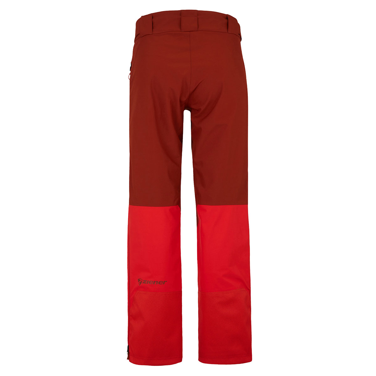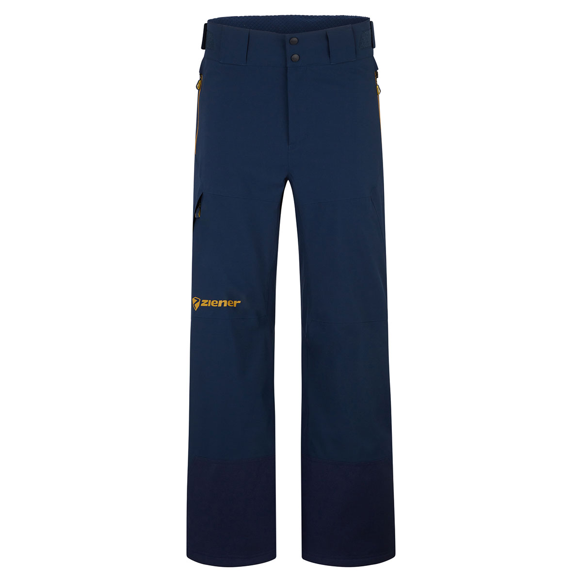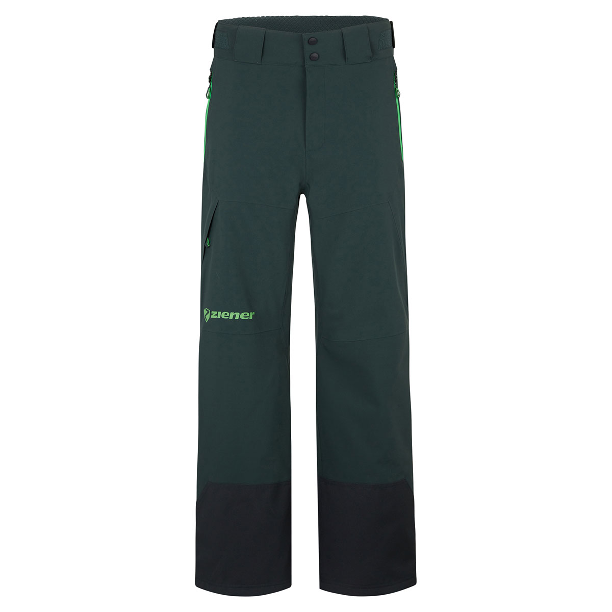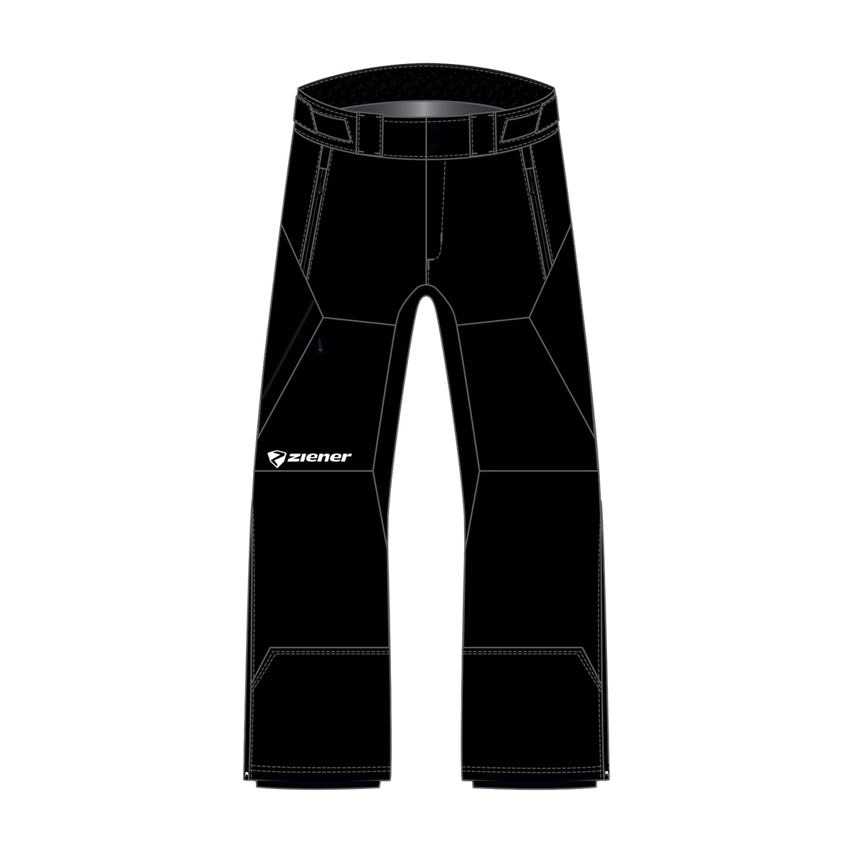 The highly functional, unpadded ZIENER TEAMWEAR TAMIR VENT-LONG-ZIP-Z MAN pants feature a warm inner lining. They are equipped with the breathable, water- and windproof ZIENER AQUASHIELD® membrane (water column 20,000 mm/breathability 20,000 g/m²/24h), which ensures a warm and dry climate. The recycled, elastic 2-layer material has a PFAS-free impregnation. Suspenders or a belt can be ordered as an option and can be attached to the belt loops provided. A long side zipper provides ventilation for optimal airflow and also makes it easy to put on and take off the pants. Reinforced edge protection and an adjustable snow guard in the pant hem round off the functional features. The side zippers and a zippered pocket on the pant leg provide storage space for smaller items. All seams are taped and completely waterproof.