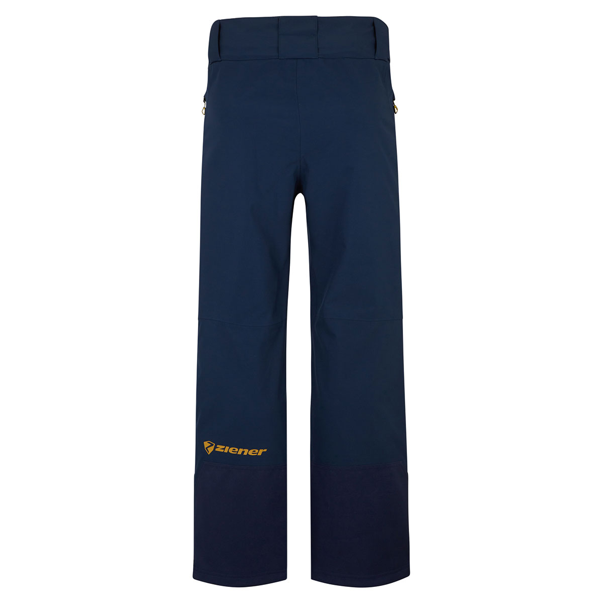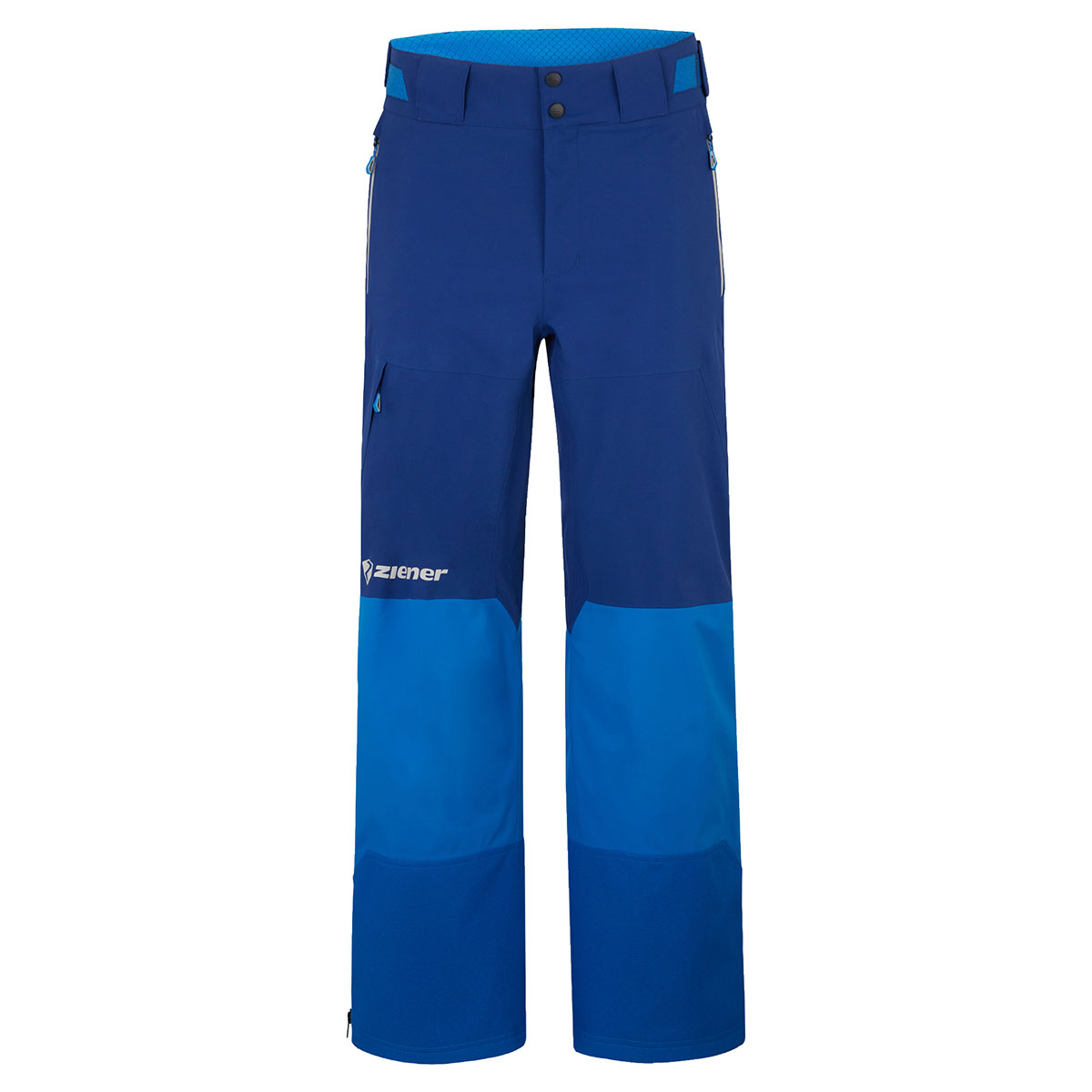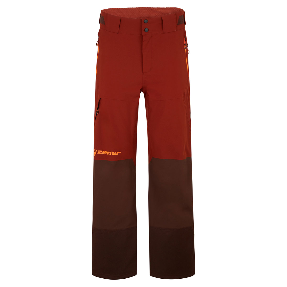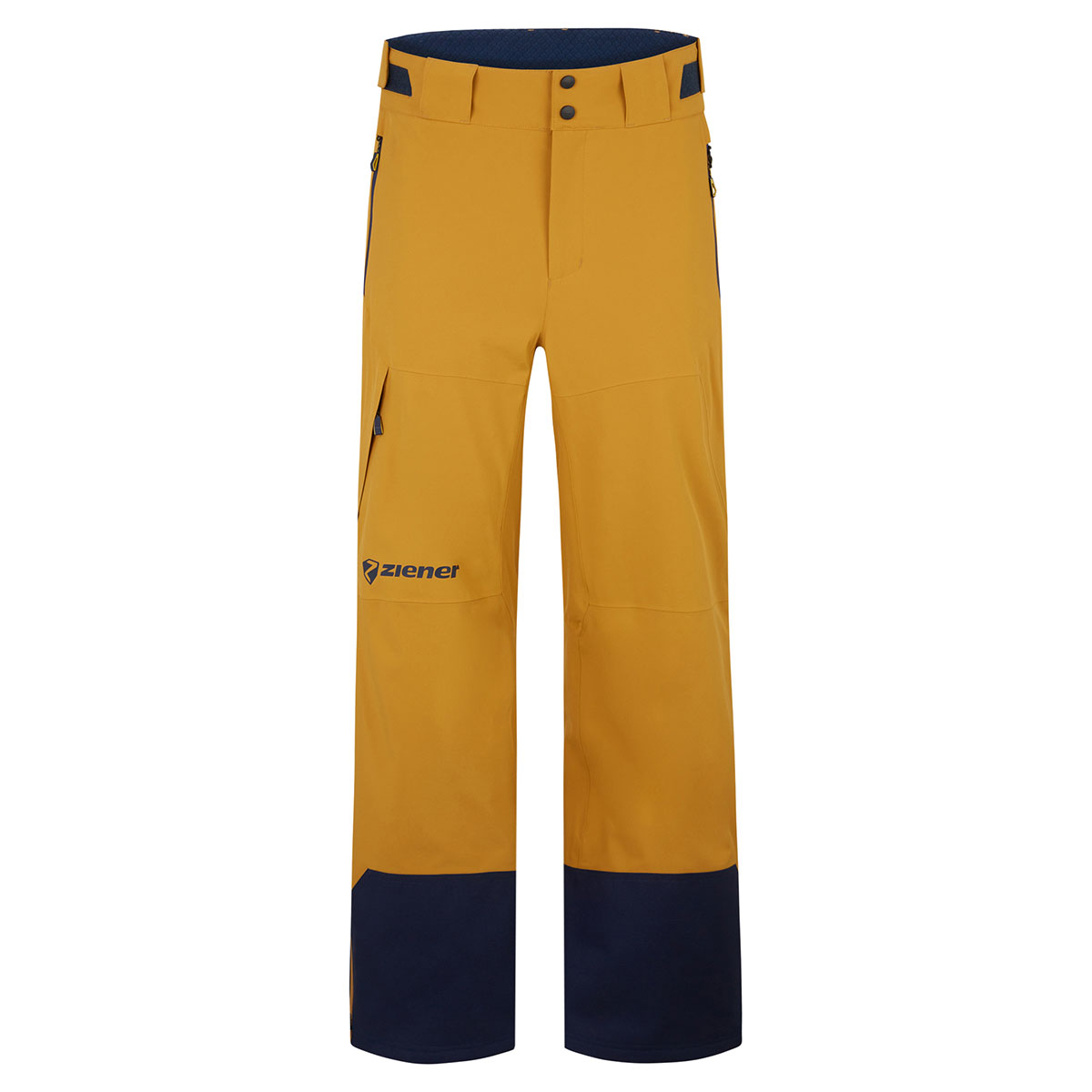 The highly functional, unpadded ZIENER TEAMWEAR TAMIR VENT-LONG-ZIP-Z MAN pants feature a warm inner lining. They are equipped with the breathable, water- and windproof ZIENER AQUASHIELD® membrane (water column 20,000 mm/breathability 20,000 g/m²/24h), which ensures a warm and dry climate. The recycled, elastic 2-layer material has a PFAS-free impregnation. Suspenders or a belt can be ordered as an option and can be attached to the belt loops provided. A long side zipper provides ventilation for optimal airflow and also makes it easy to put on and take off the pants. Reinforced edge protection and an adjustable snow guard in the pant hem round off the functional features. The side zippers and a zippered pocket on the pant leg provide storage space for smaller items. All seams are taped and completely waterproof.