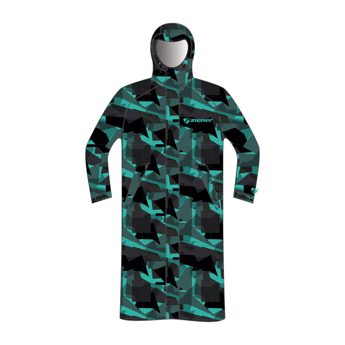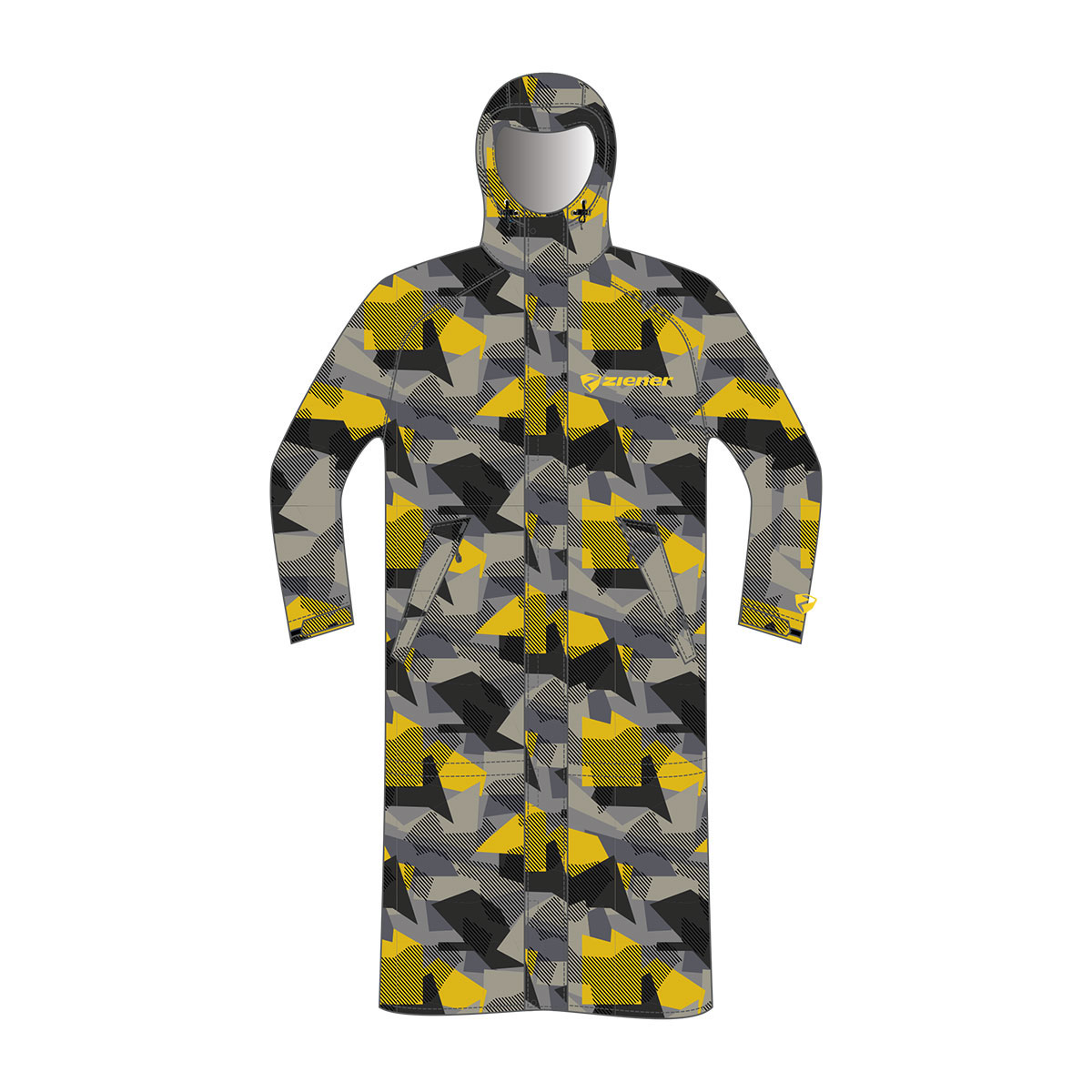 The highly functional ZIENER RCE COACH COAT-Z UNISEX raincoat with fixed hood is ideal for wearing over ski clothing in adverse weather conditions. The use of the breathable, windproof, and waterproof Dermizax® membrane (water column 20,000 mm/breathability 10,000 g/m²/24h) makes it particularly durable and robust. Two large zippered pockets and an integrated pocket offer optimal storage options. The coat can be shortened if necessary and fastened with buttons. The extra-large hood can be worn over a ski helmet.