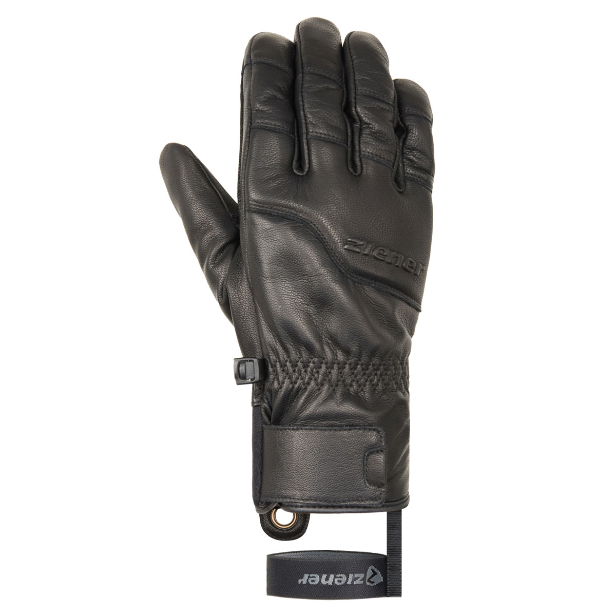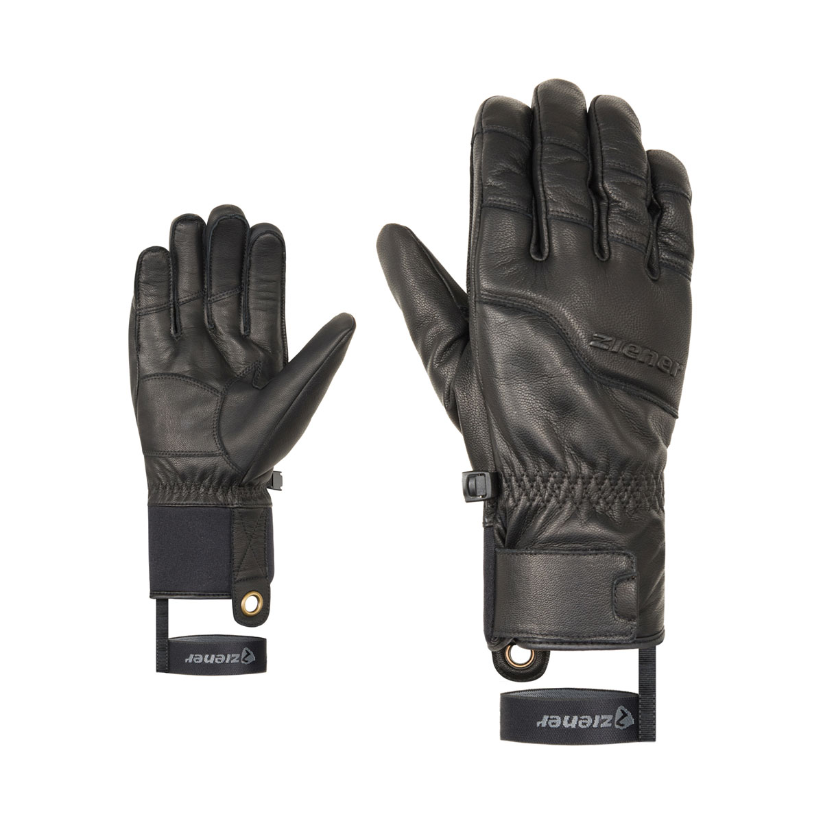 The modern ZIENER GISMON-Z AS® PR TOUCH ski gloves made of goatskin are equipped with excellent PrimaLoft® Gold padding for warmth and offer maximum comfort. The neoprene cuff with Velcro fastener at the wrist closes tightly so that the glove can be worn comfortably under the jacket sleeve. The ZIENER AQUASHIELD® membrane with its waterproof and windproof properties ensures an optimal climate inside the glove. The integrated TOUCH function allows touchscreens to be operated while wearing the gloves. The practical leash reliably secures the glove to the wrist, even when removing it quickly. The product contains non-textile parts of animal origin.