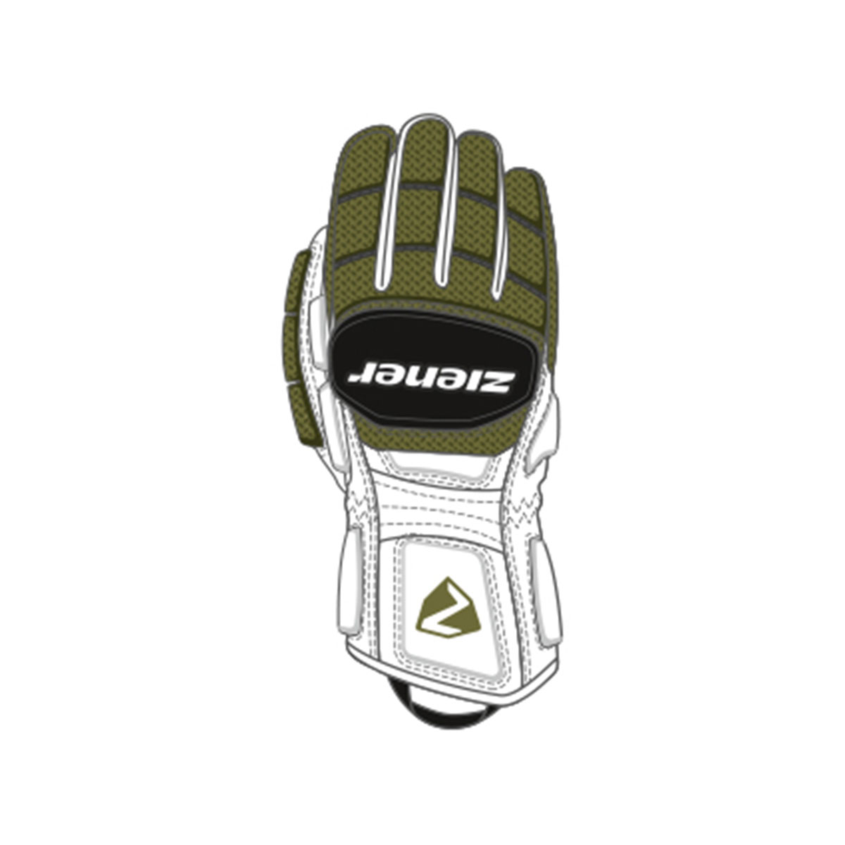 The highly athletic ZIENER GATOS-Z PR racing gloves feature a robust, non-slip palm made from high-quality goatskin, ensuring perfect grip and direct power transfer to the ski pole. The PrimaLoft® Gold insulation keeps you warm even in freezing temperatures. In addition, these highly athletic ski gloves feature a rubberized, non-slip palm patch that serves as reinforcement. The area on the back of the hand that is subject to the most wear is equipped with generous inserts made of abrasion-resistant Schoeller® Ceraspace™ material. The gloves are equipped with a plastic protector on the knuckles, which was developed in collaboration with ORTEMA®. The product contains non-textile parts of animal origin.