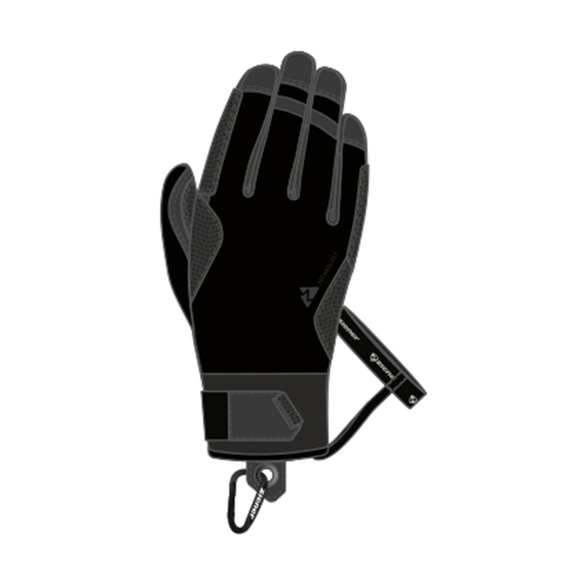 The extremely robust and tactile ZIENER LATEMARSPITZE-Z AS® AW mountain sports glove is extremely versatile. Thanks to the ZIENER AQUASHIELD® membrane, it is breathable, waterproof, and windproof. The ZIENER THERMOSHIELD® ACTIVE offers high thermal performance thanks to the use of lavalan® wool – even when wet. The natural temperature regulation makes the glove ideal for changing conditions. The tactile leather palm and very sturdy workmanship provide support for active mountain sports in winter. Additional features include an elastic leash and attached carabiner. The glove contains a proportion of recycled materials and the waterproofing is PFAS-free.