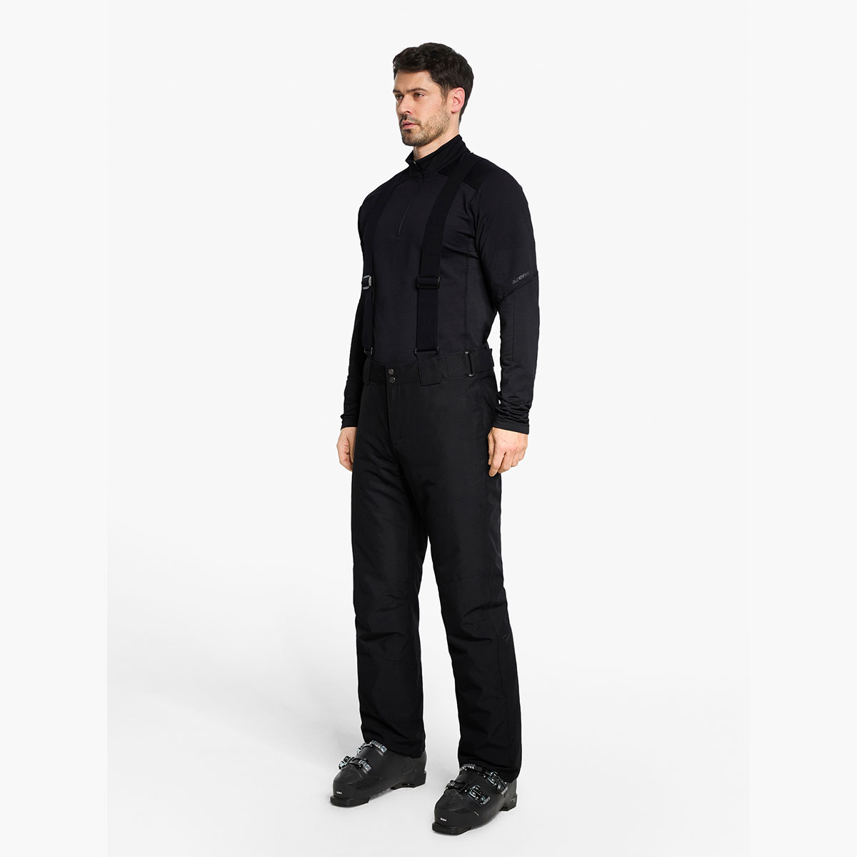 The functional, padded ZIENER men's ski pants TAGA-Z MAN with adjustable waistband impress with their classic look. The fixed suspenders make these pants a fashionable highlight on the slopes. They are equipped with the breathable, waterproof and windproof ZIENER AQUASHIELD® membrane (water column 10,000mm/breathability 10,000g/m²/24h). This ensures a warm and dry climate. An 80g/m² padding made of breathable and lightweight insulation material maintains the thermal balance even when damp - for a particularly high level of comfort. The waterproofing of the pants is PFAS-free. The outer fabric is bluesign® and Standard 100 by OEKO-TEX® certified. The seams are taped. Two side pockets provide plenty of storage space. Technical details such as a fixed snow skirt, reinforced edge guard and an adjustable waistband with belt loops contribute to a high level of functional comfort