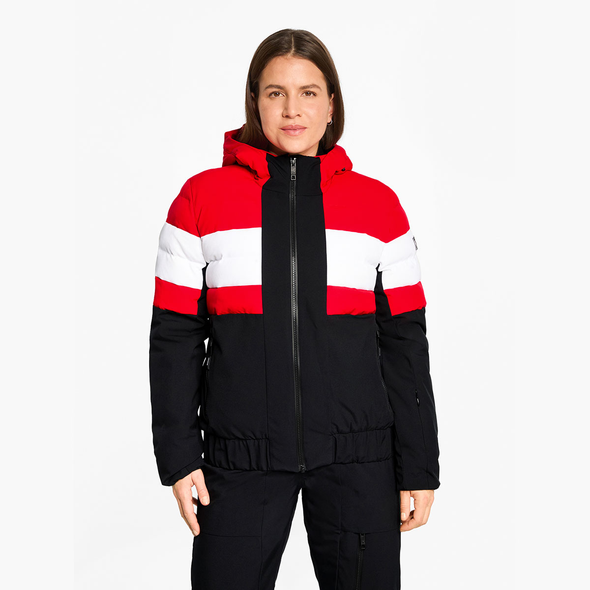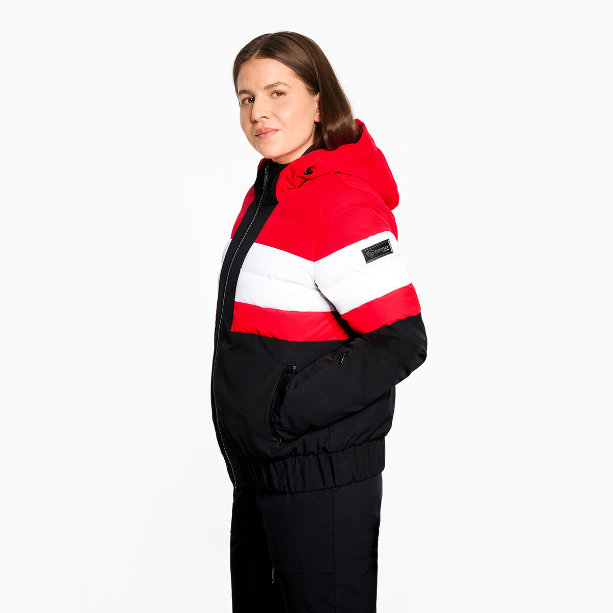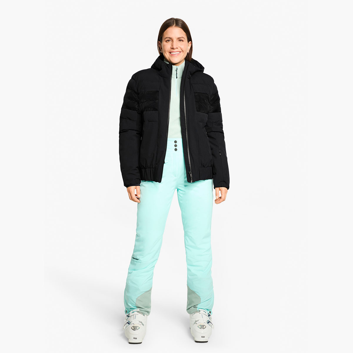 The short, fashionable ZIENER ladies' ski jacket TINDA-Z LADY scores points with its high elasticated waistband and feminine look. The breathable, waterproof and windproof ZIENER AQUASHIELD® membrane (water column 10,000mm/breathability 10,000g/m²/24h) ensures a warm and dry climate. In addition, the high-quality Comfortemp® padding keeps you particularly warm even on cold days and ensures a natural climate without overheating. The high collar provides additional warmth. The jacket is impregnated and PFAS-free. The outer fabric is bluesign® certified. Technical details such as a fixed, adjustable functional hood and elasticated inner sleeve cuffs contribute to the high functional comfort of this jacket. The elastic inner lining ensures optimum freedom of movement. Waterproof zippers and a snow skirt are also part of the basic equipment. The numerous pockets for ski goggles, sunglasses, smartphone and ski pass are additional functional details of the jacket.