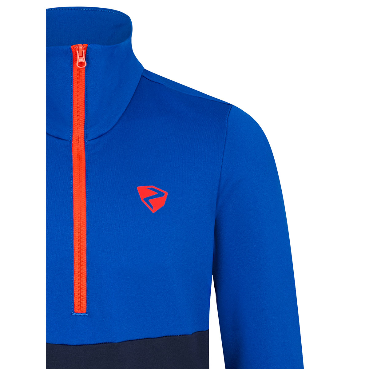 The functional, warm ZIENER JARPS JUNIOR mid-layer for children is made from particularly soft and quick-drying stretch material - for optimum freedom of movement and high functionality. The roughened inside of the fabric makes the skin feel warm and comfortable. The stand-up collar with half front zipper keeps wind and cold away from the neck. The stylish print on the back creates a casual look.