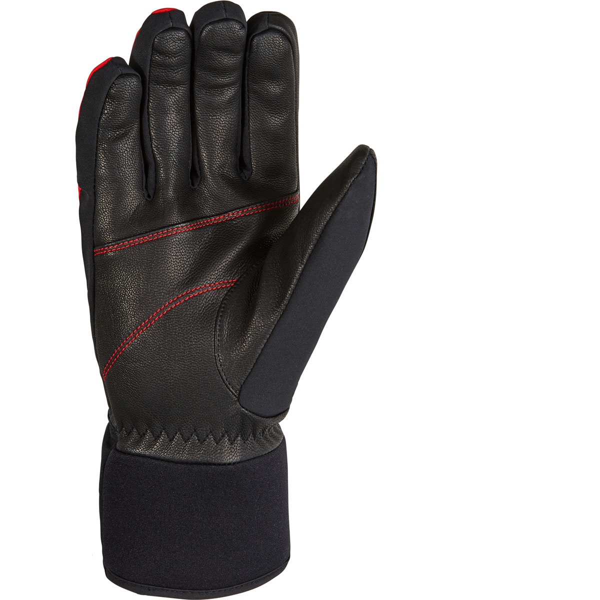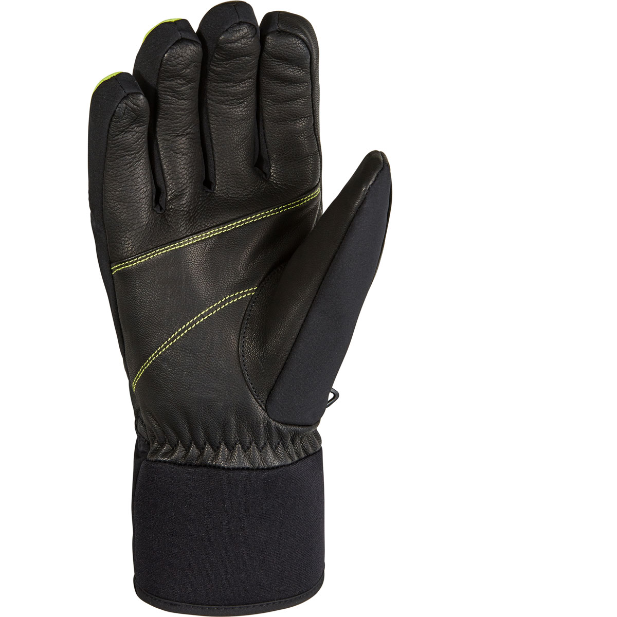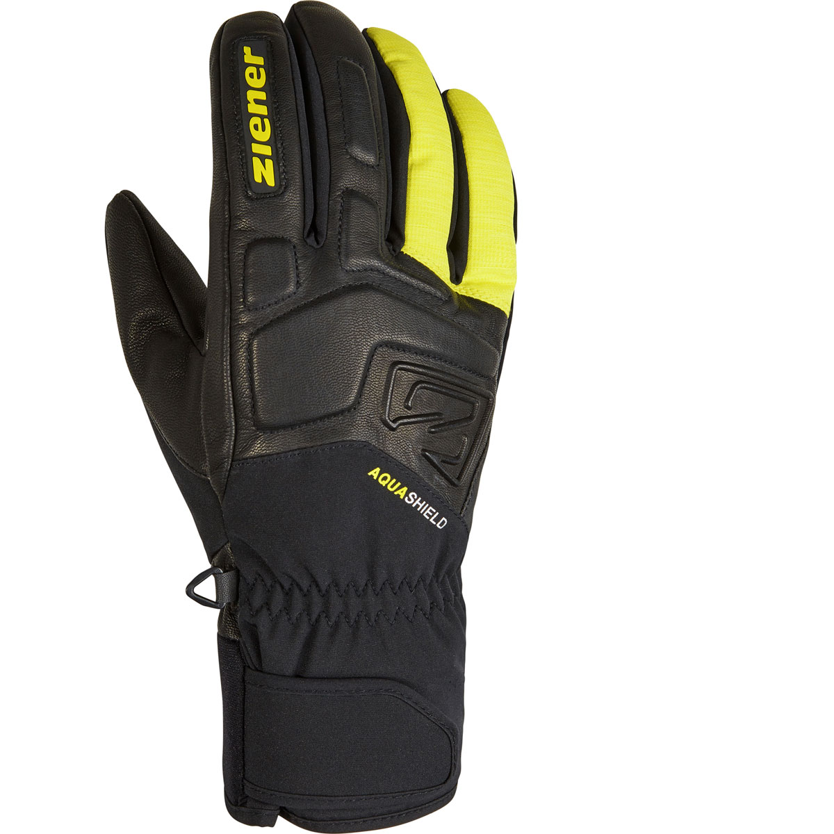 The high-quality, modern ZIENER men's ski gloves GLYXUS AS® are equipped with the waterproof and windproof ZIENER AQUASHIELD® membrane, which ensures a warm and dry climate. A combination of stretch materials and leather inserts in the backhand ensure particular robustness and flexibility. The grippy goat leather palm provides optimum power transmission and grip on the ski pole. The neoprene cuff on the wrist and the wide Velcro strap allow the glove to be worn under a jacket. The product contains non-textile parts of animal origin. The outer fabric is bluesign® and Standard 100 by OEKO-TEX® certified.