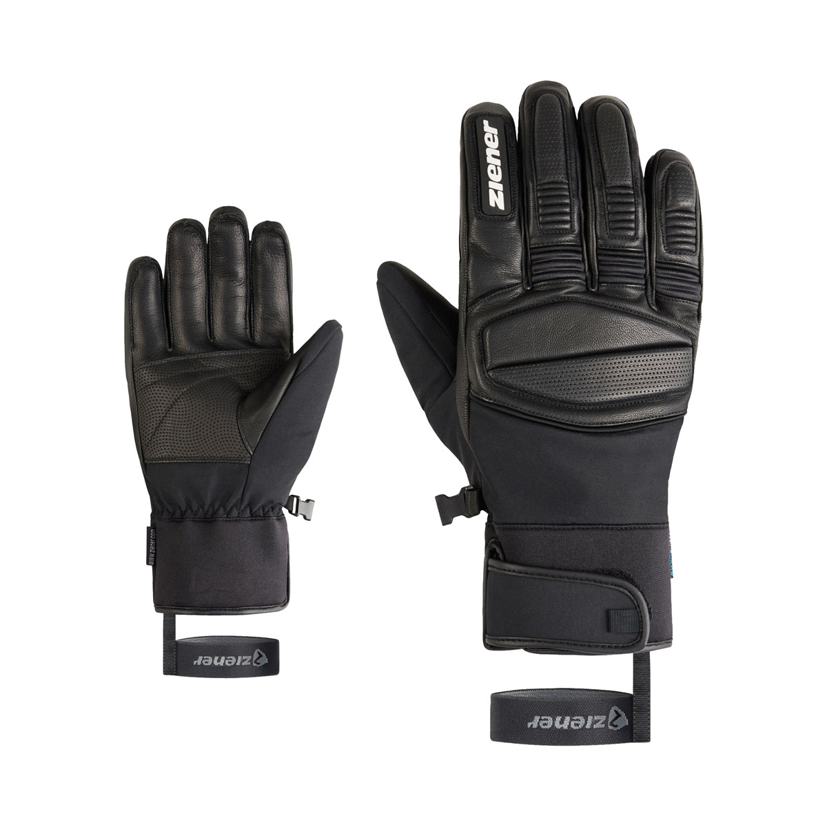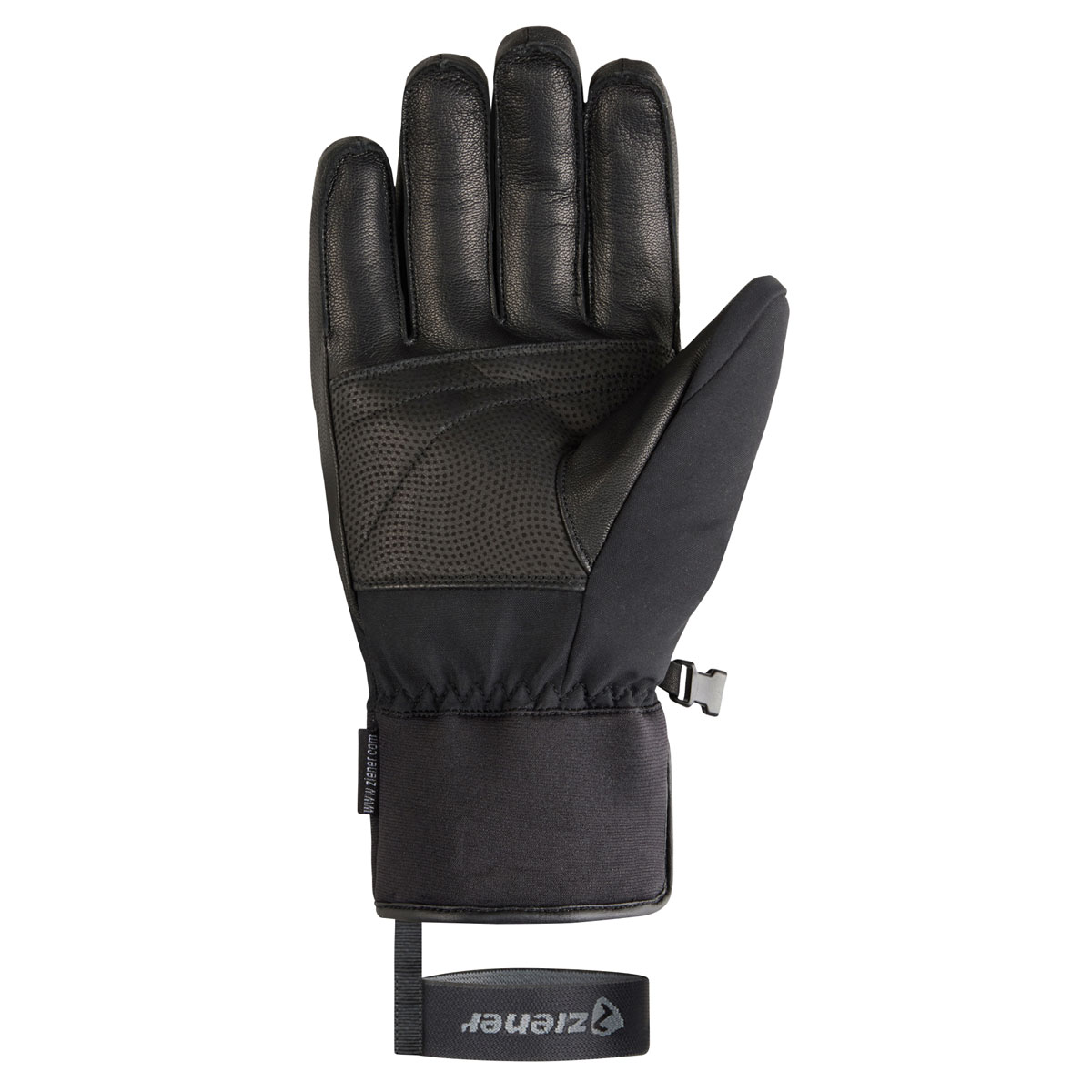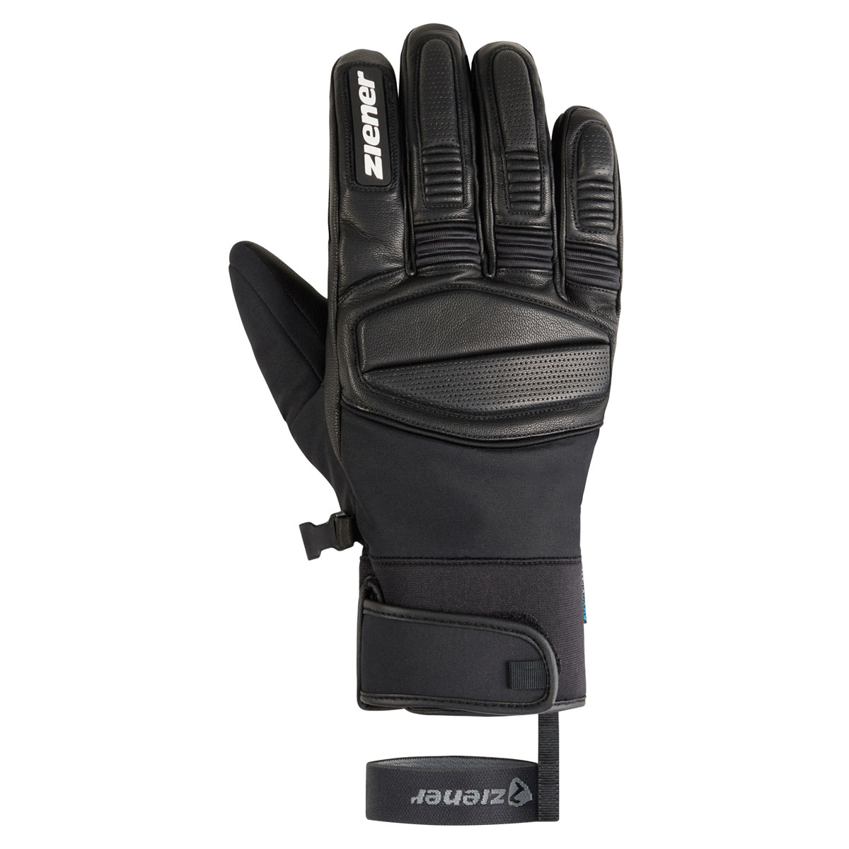 The very sporty Ziener GOZIM-Z AS® men's ski gloves are equipped with a breathable, waterproof and windproof ZIENER AQUASHIELD® membrane. The grippy leather palm ensures perfect power transmission on the ski pole. The knuckles are lightly padded. The neoprene cuff with Velcro closure on the wrist closes tightly so that the glove can be worn comfortably under the jacket sleeve, while the practical leash reliably secures the glove to the wrist even when quickly removed. The product contains non-textile parts of animal origin. The outer fabric is bluesign® and Standard 100 by OEKO-TEX® certified.
