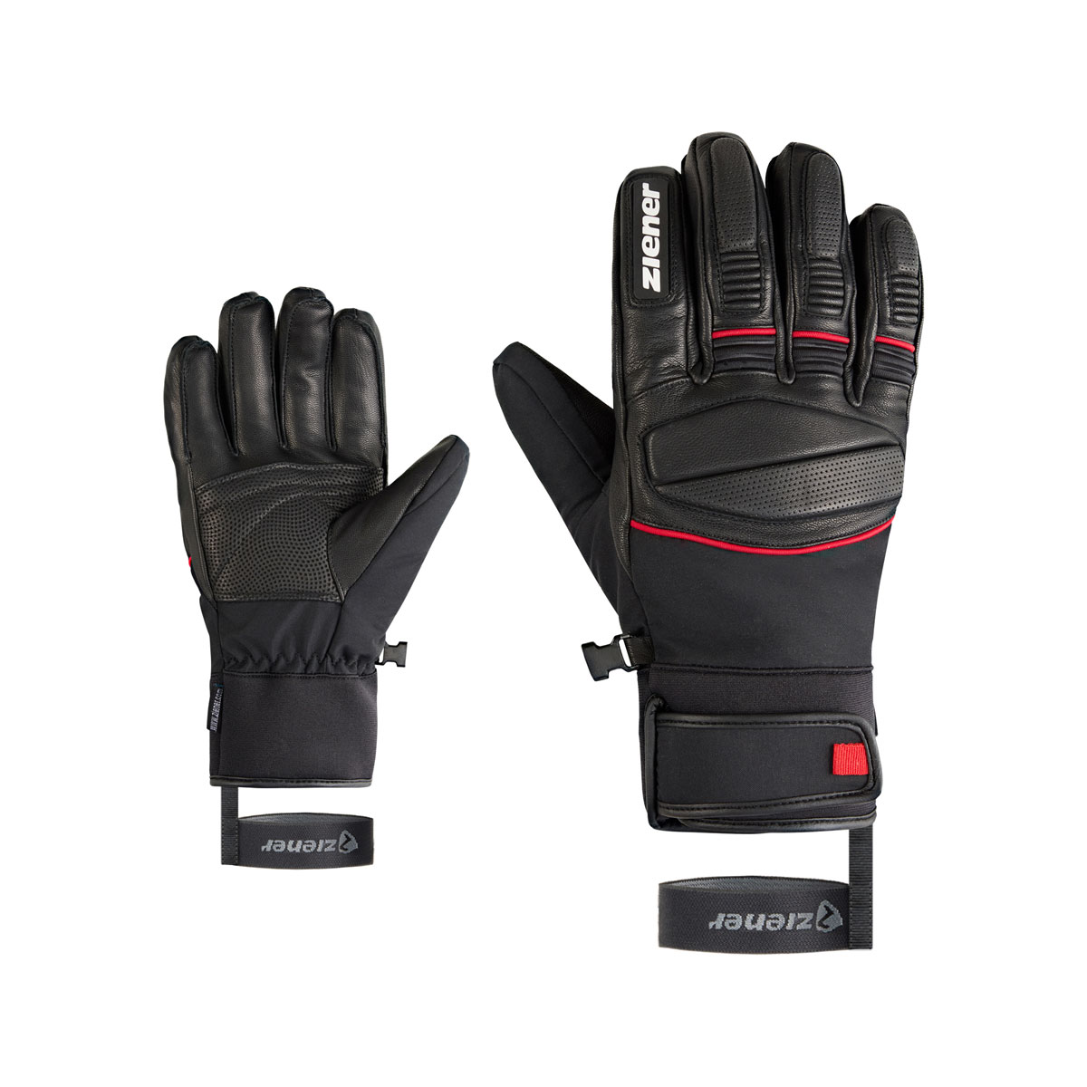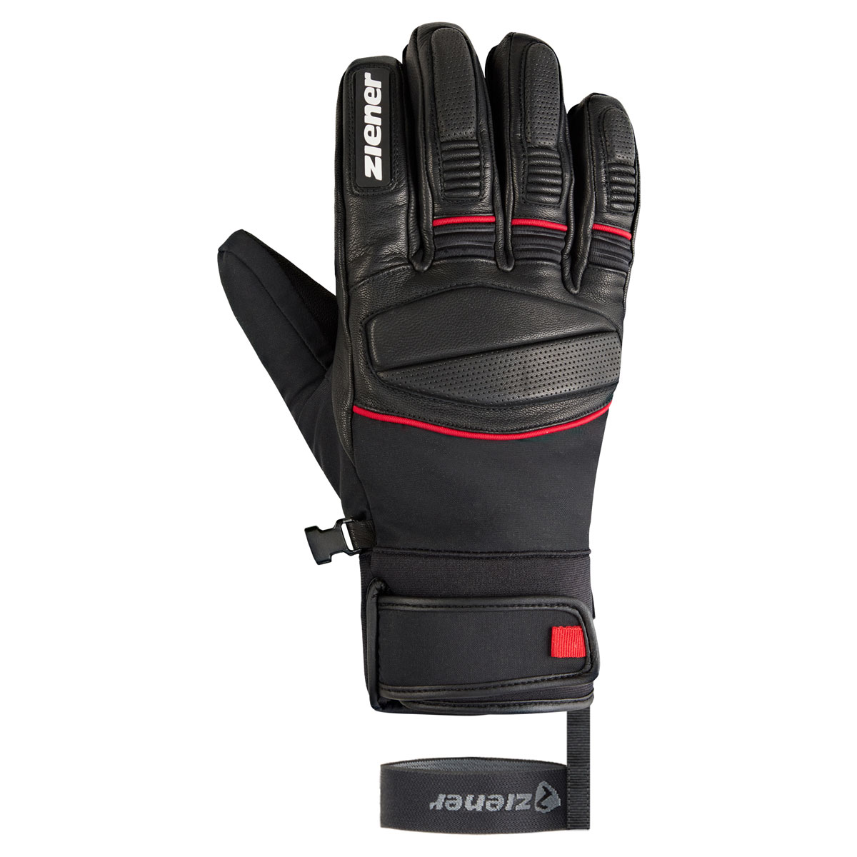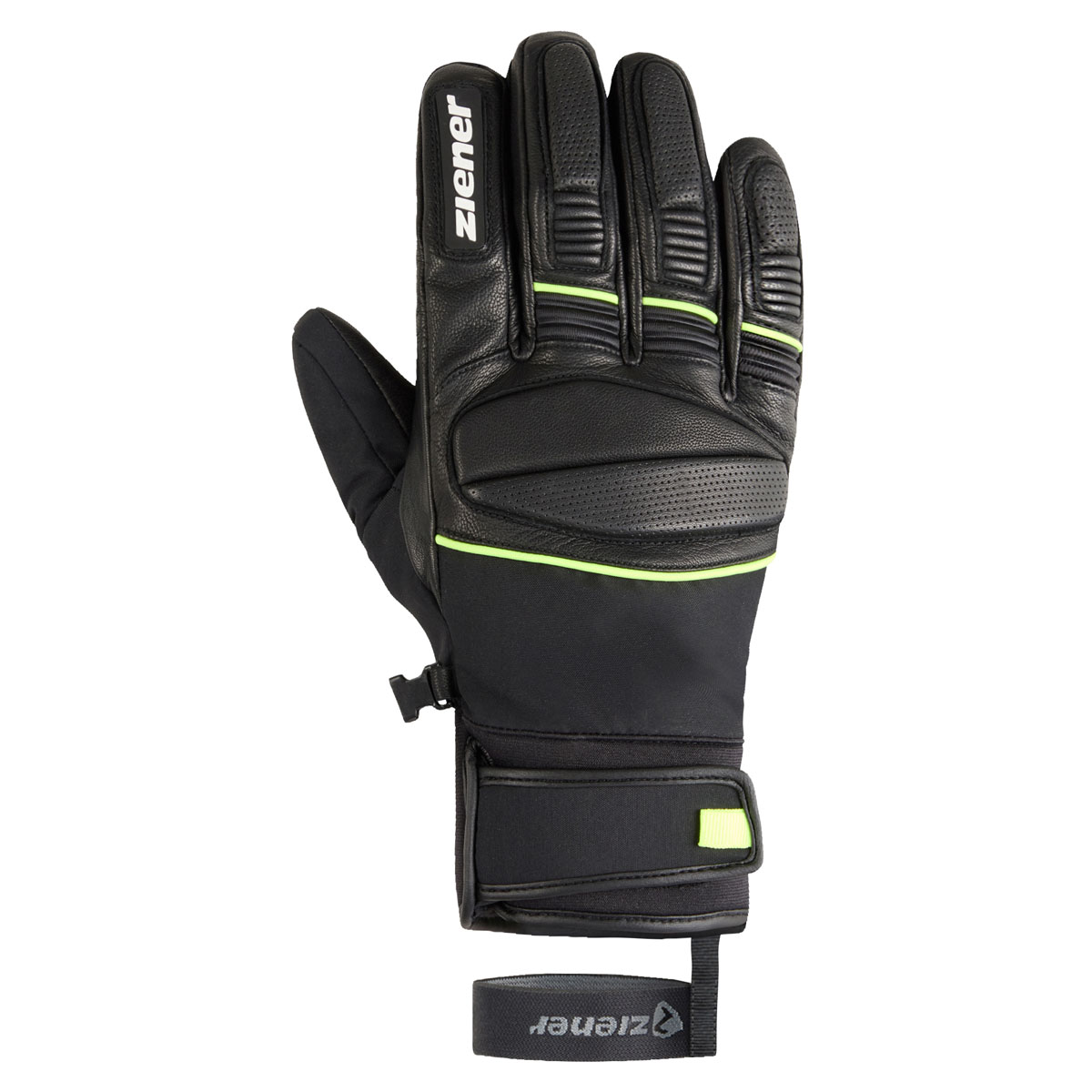 The very sporty Ziener GOZIM-Z AS® men's ski gloves are equipped with a breathable, waterproof and windproof ZIENER AQUASHIELD® membrane. The grippy leather palm ensures perfect power transmission on the ski pole. The knuckles are lightly padded. The neoprene cuff with Velcro closure on the wrist closes tightly so that the glove can be worn comfortably under the jacket sleeve, while the practical leash reliably secures the glove to the wrist even when quickly removed. The product contains non-textile parts of animal origin. The outer fabric is bluesign® and Standard 100 by OEKO-TEX® certified.