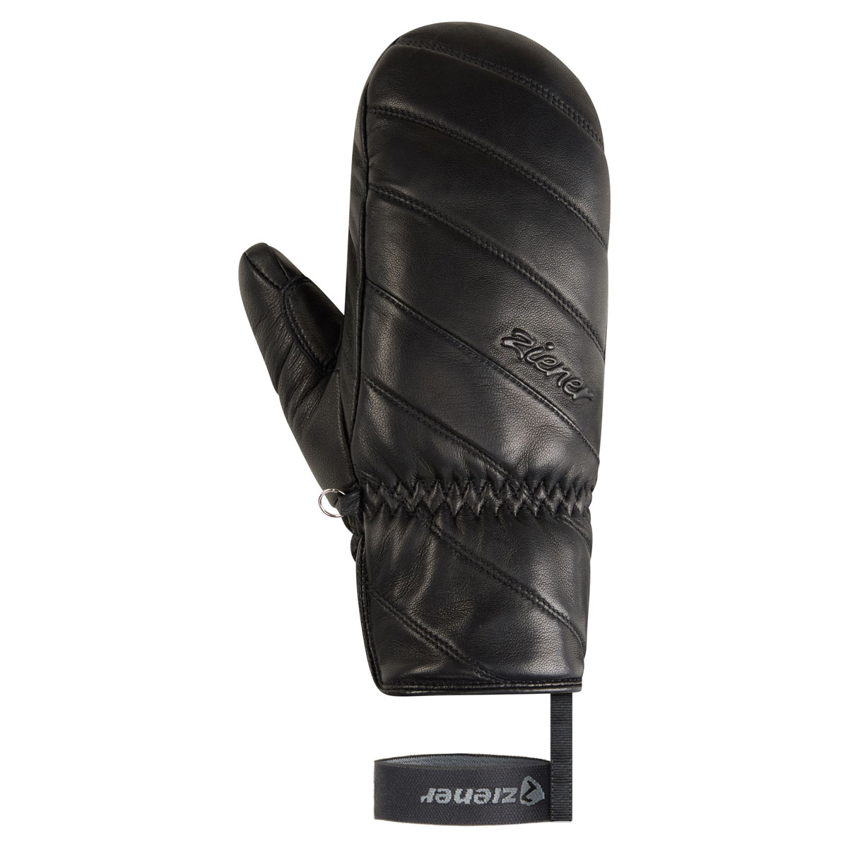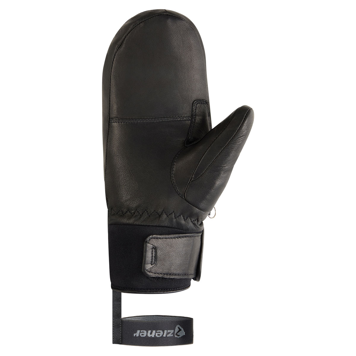 The sporty and warm ZIENER leather ski mittens KANNI-Z AS® PR MIITEN LADY keep you warm and cozy even on cold days thanks to the excellent warming PrimaLoft® Gold insulation. The additional 5-finger fleece lining keeps the body temperature in the comfort zone at all times and ensures a pleasant wearing comfort. The ZIENER AQUASHIELD® membrane with its waterproof and windproof properties ensures an optimum climate in the glove. The high-quality lambskin leather lining ensures plenty of flexibility. The soft leather palm is both tactile and robust. The cuff can be adjusted with a Velcro fastener on the inside. The practical leash reliably secures the glove to the wrist, even when quickly removed. The product contains non-textile parts of animal origin.