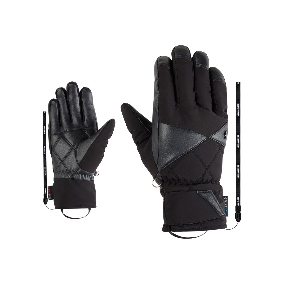 The sporty and modern ZIENER ladies' ski gloves KOANA-Z AS® PR LADY are made from highly breathable PFAS-free AQUAIR synthetic leather and are 100% vegan. The very soft material with a leather look offers maximum comfort. The PrimaLoft® Gold insulation provides excellent warmth even in extreme conditions. The cuff can be adjusted with a Velcro fastener and worn over or under the sleeve. The practical leash reliably secures the glove to the wrist, even when quickly removed. The outer fabric is bluesign® and Standard 100 by OEKO-TEX® certified.