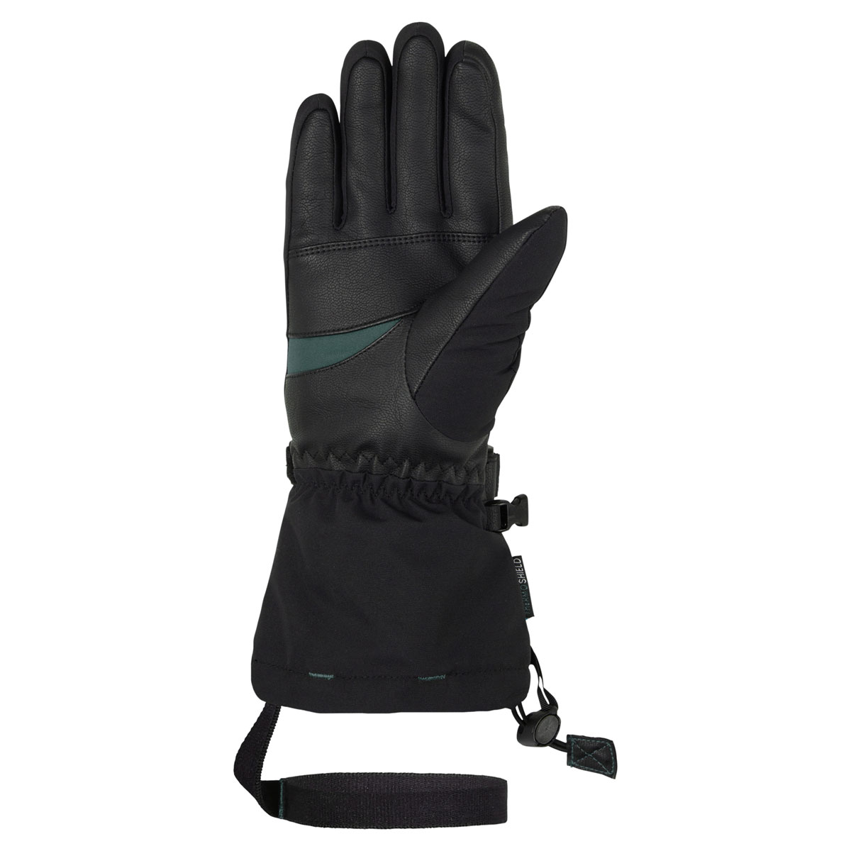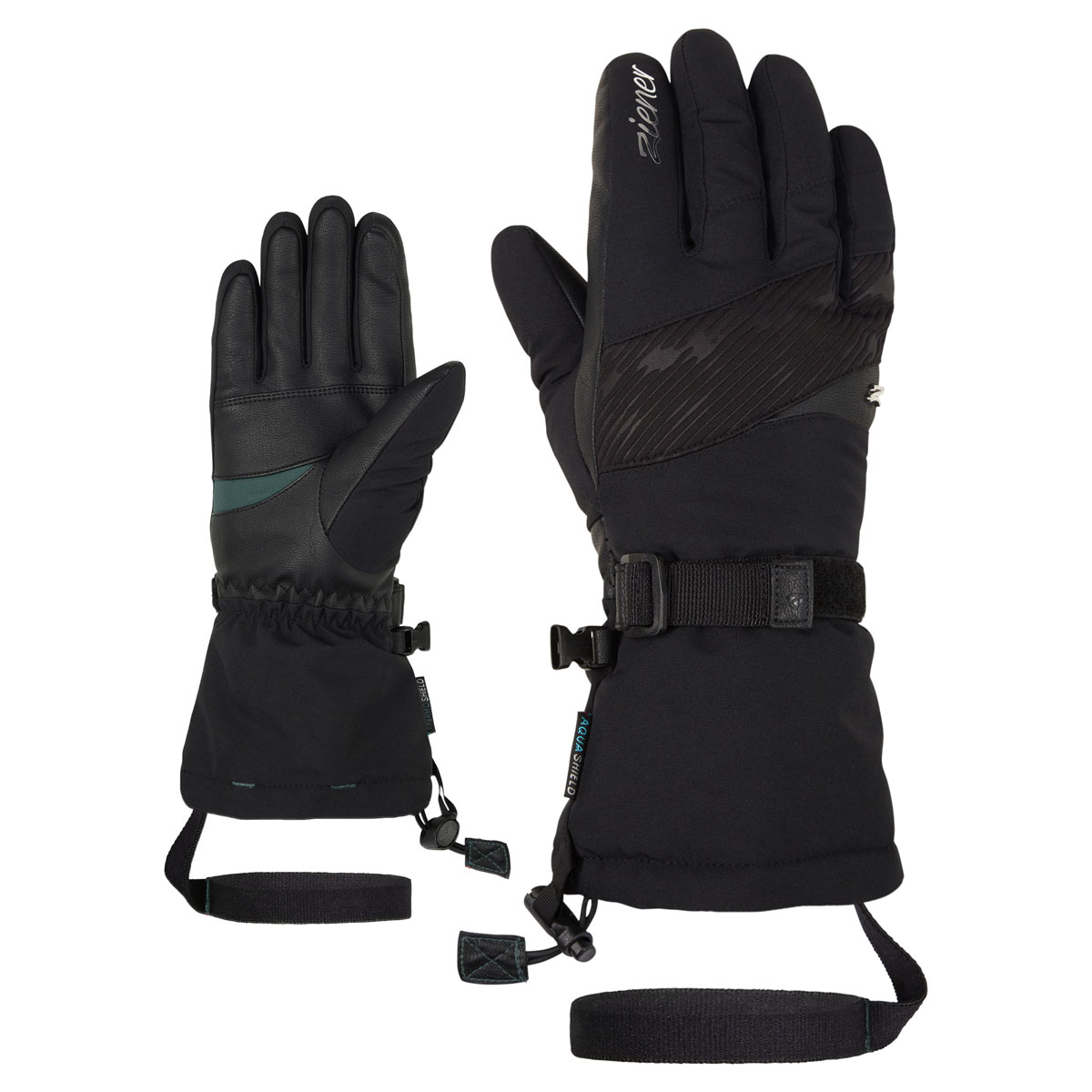 The sporty, modern KALICE-Z AS® LADY women's ski gloves are equipped with a waterproof and windproof ZIENER AUQASHIELD® membrane, which ensures a warm and dry climate inside the glove. The warming plush lining keeps the body temperature in the comfort zone at all times and ensures a comfortable fit. The long cuff prevents snow from getting in. The cordlock system allows the glove cuff to be fastened over the jacket sleeve with one hand. The strap fastener on the wrist ensures a perfect fit. The practical leash reliably secures the glove to the wrist even when it is taken off quickly. The outer fabric is bluesign® and Standard 100 by OEKO-TEX® certified.
