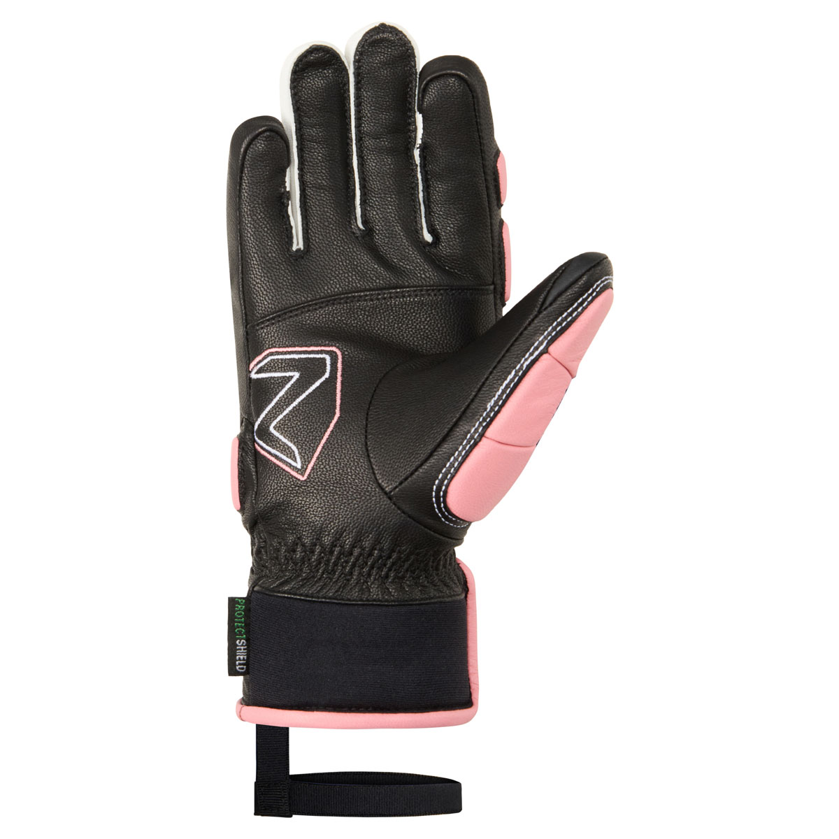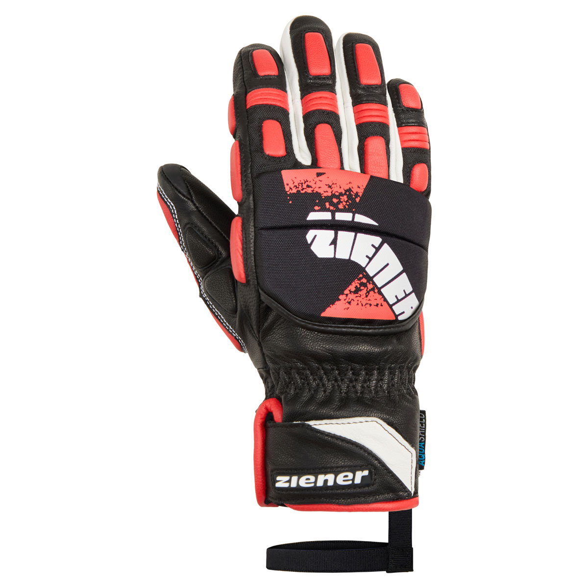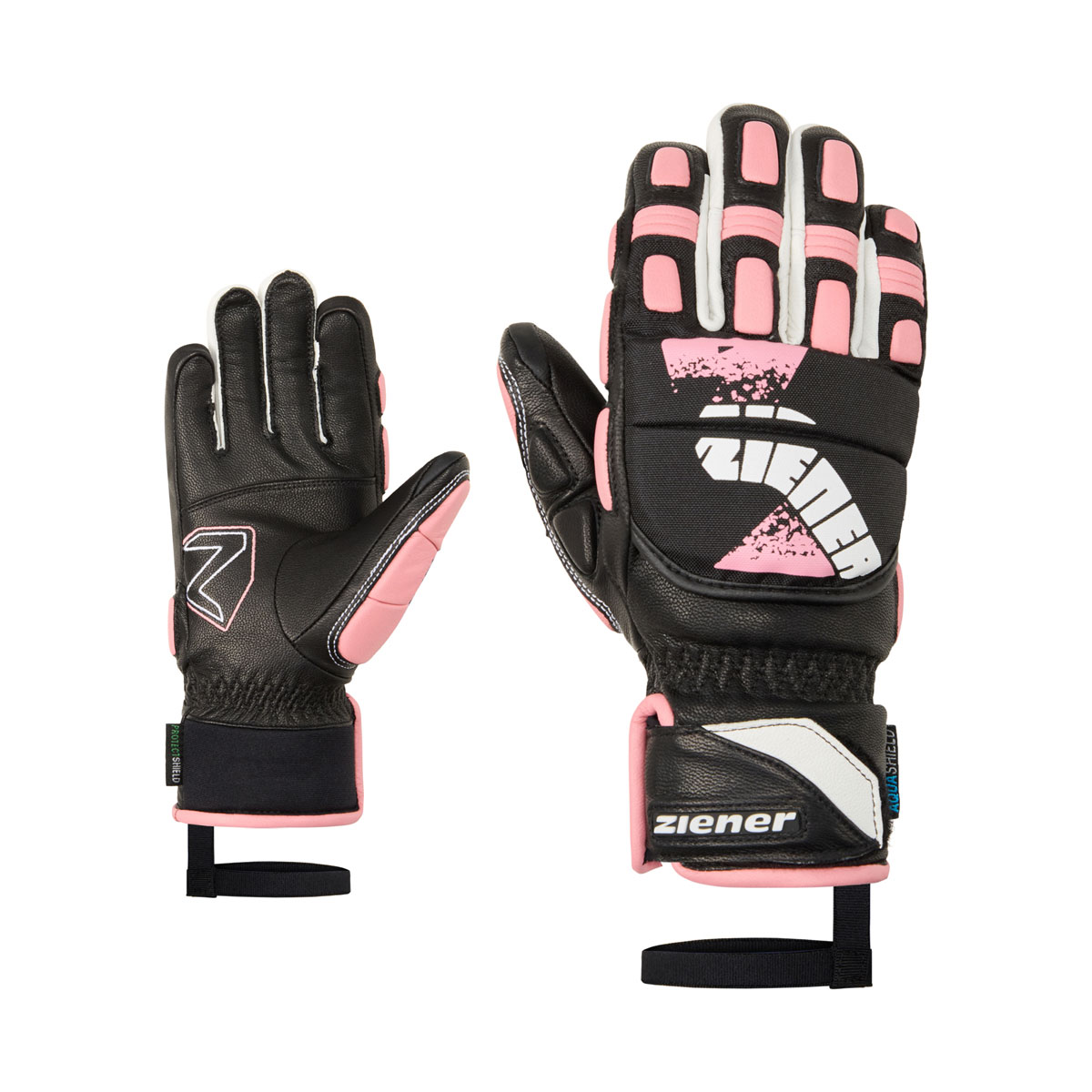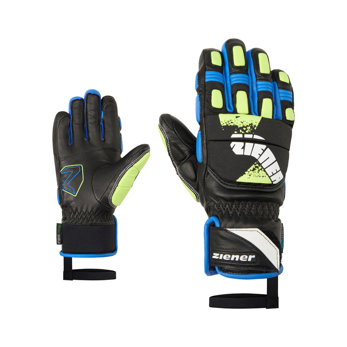 The extremely sporty ZIENER children's ski glove LONOS-Z AS® PR JUNIOR with its waterproof and warm properties is perfect for the next generation of ski racers. The race gloves have a fully padded backhand and thumb area. The soft leather palm provides additional grip. The PrimaLoft® Gold insulation provides excellent warmth even in extreme conditions. The ZIENER AQUASHIELD® membrane with its waterproof and windproof properties ensures an optimum climate in the glove. The close-fitting neoprene cuff makes it easier to attach a protector to the lower arm and improves comfort in combination with the racing suit. The loop on the wrist makes it easier to put on. The product contains non-textile parts of animal origin.