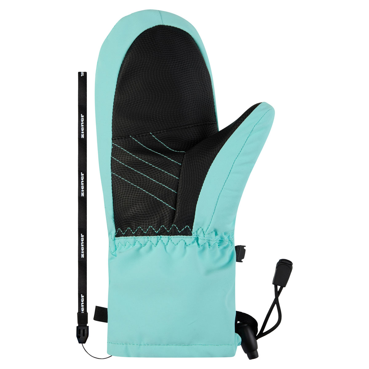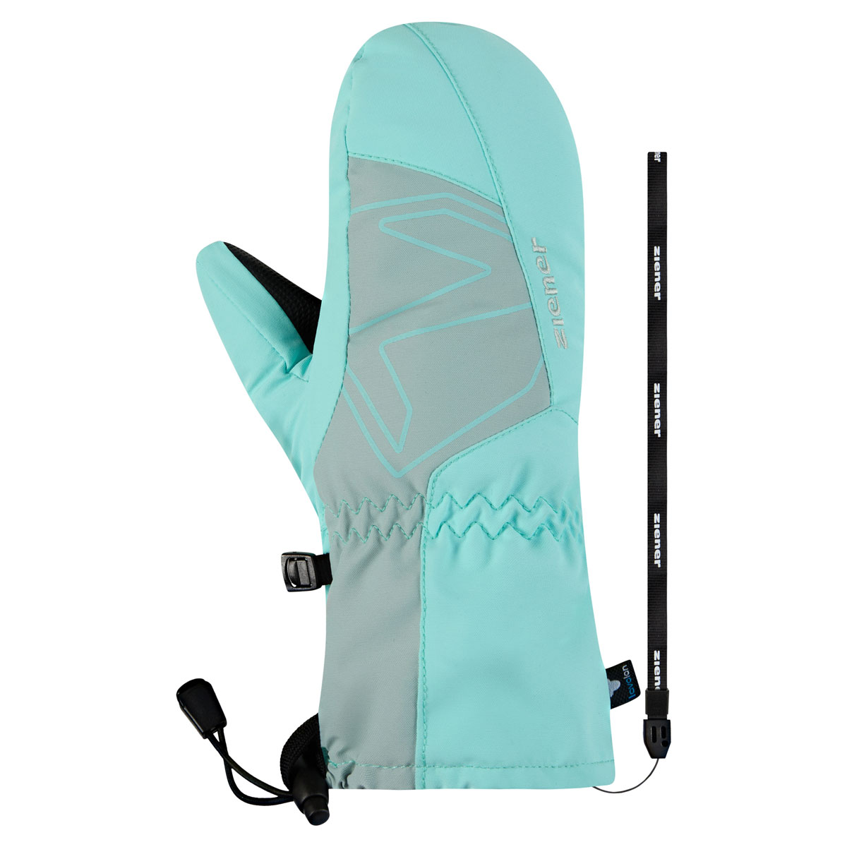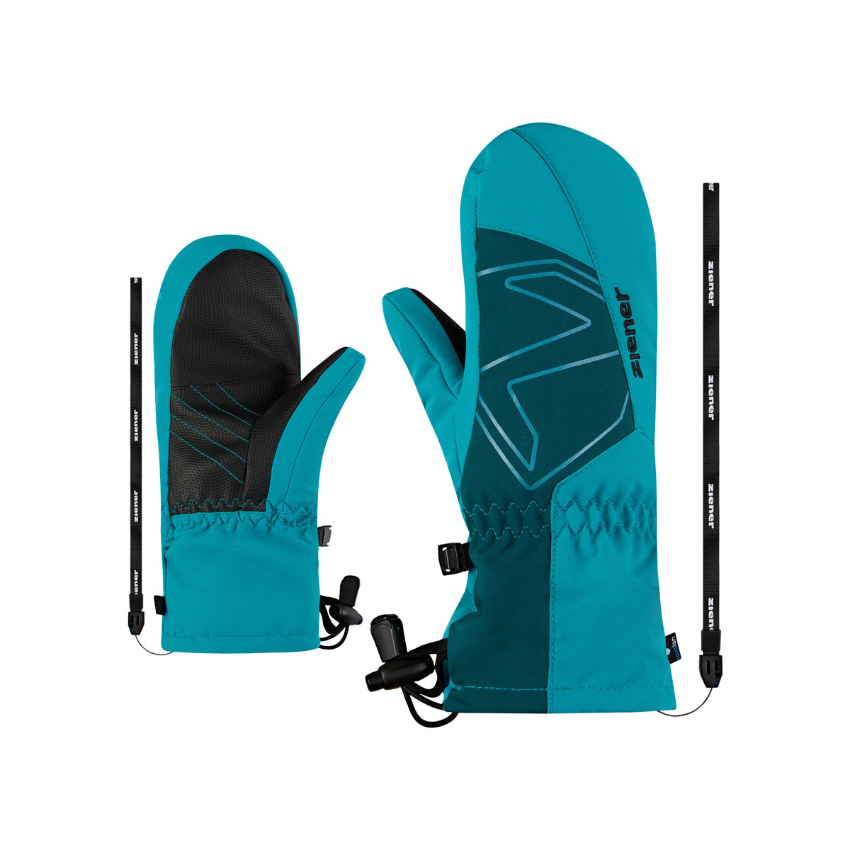 The trendy ZIENER ski mittens LAVALINO-Z AS® AW MITTEN JUNIOR keep children's hands cozy and warm thanks to the comfortable lavalan® wool padding. The additional plush lining keeps hands extra warm. They are also equipped with the waterproof and windproof ZIENER AQUASHIELD® membrane, which ensures a dry climate. The robust materials are made for heavy-duty use and score points for their durability - so nothing stands in the way of fun in the snow. The long cuffs with cordlock cuffs can be worn over the jacket and can be easily adjusted with just one hand. The practical leash reliably secures the glove to the wrist, even when you take it off quickly. The outer fabric is bluesign® and Standard 100 by OEKO-TEX® certified.