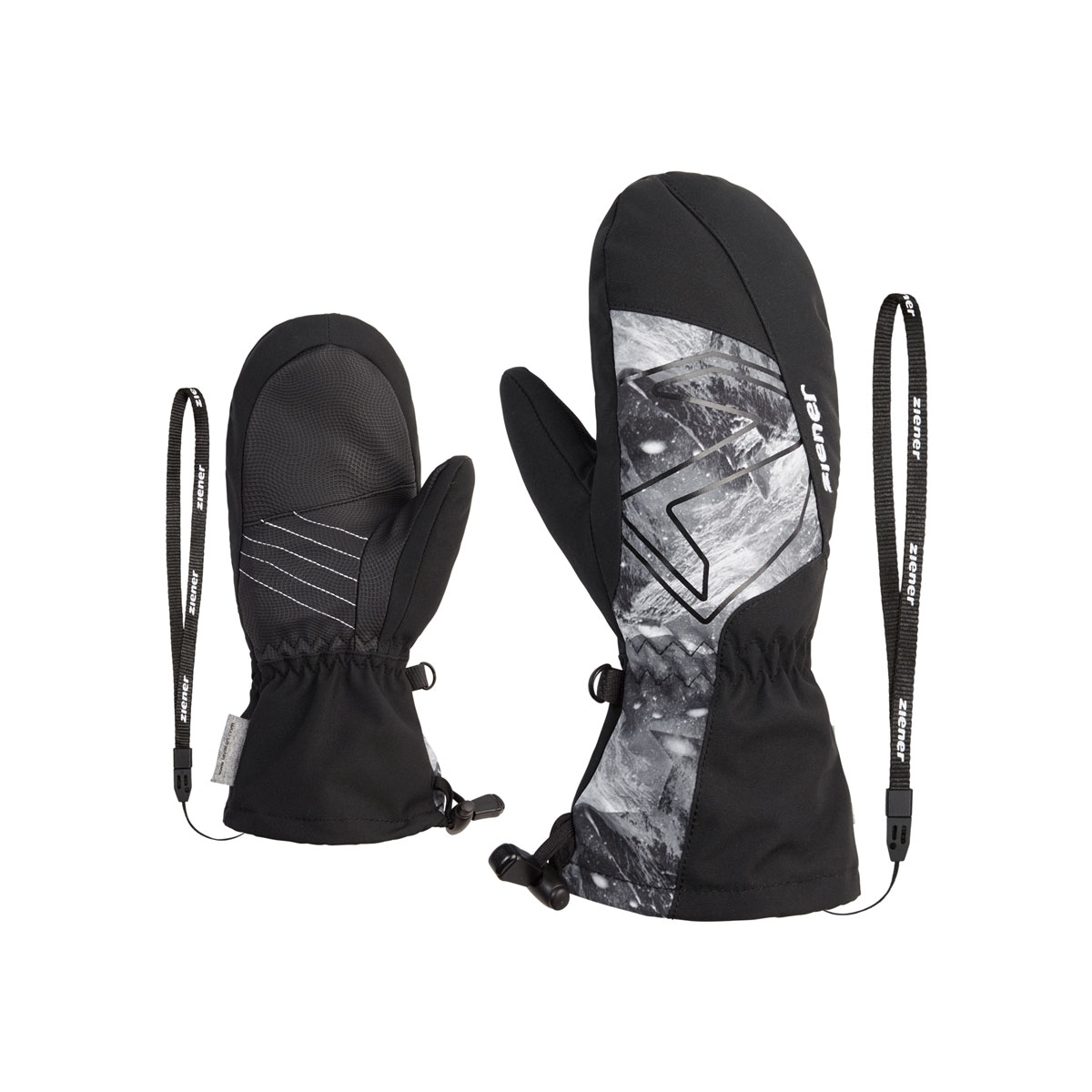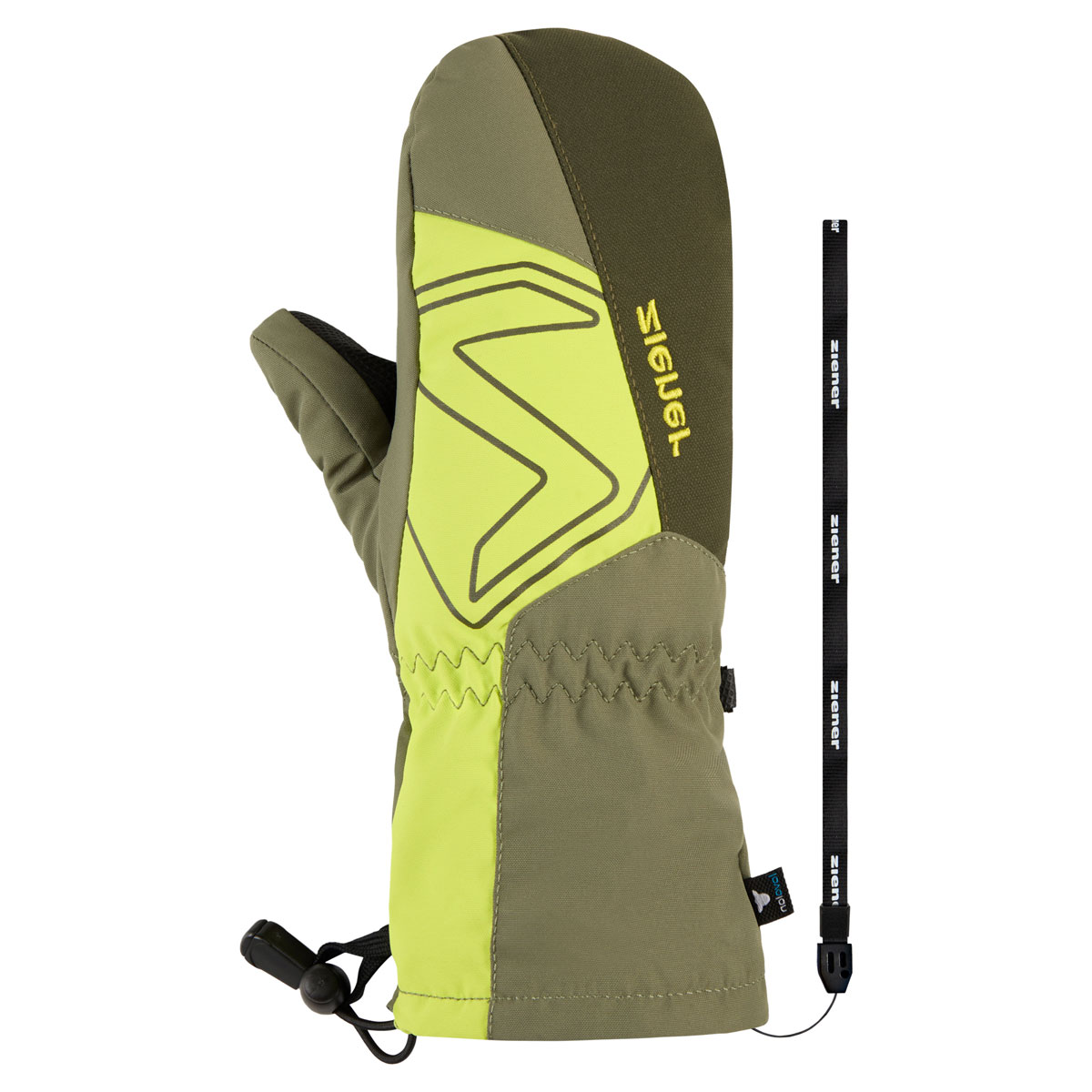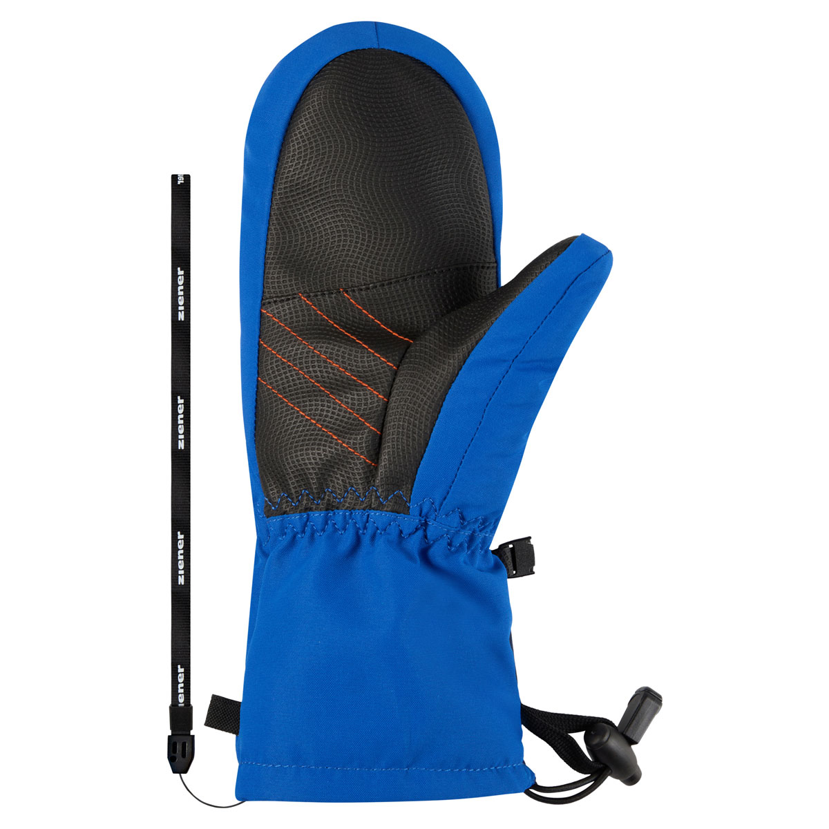 The trendy ZIENER ski mittens LAVALINO-Z AS® AW MITTEN JUNIOR keep children's hands cozy and warm thanks to the comfortable lavalan® wool padding. The additional plush lining keeps hands extra warm. They are also equipped with the waterproof and windproof ZIENER AQUASHIELD® membrane, which ensures a dry climate. The robust materials are made for heavy-duty use and score points for their durability - so nothing stands in the way of fun in the snow. The long cuffs with cordlock cuffs can be worn over the jacket and can be easily adjusted with just one hand. The practical leash reliably secures the glove to the wrist, even when you take it off quickly. The outer fabric is bluesign® and Standard 100 by OEKO-TEX® certified.