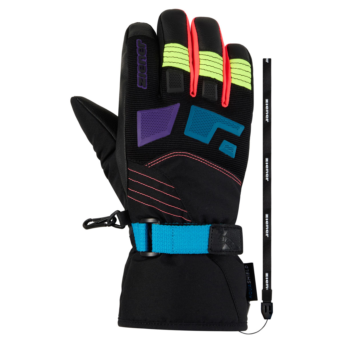 The trendy ZIENER children's ski gloves LUKIAN-Z AS® JUNIOR with long cuff are worn over a jacket. They are equipped with the waterproof and windproof ZIENER AQUASHIELD® membrane, which ensures a warm and dry climate. The compact palm provides optimum power transmission on the ski pole and the strap on the wrist ensures a perfect fit. The practical leash reliably secures the glove to the wrist, even when quickly removed. The outer fabric is bluesign® and Standard 100 by OEKO-TEX® certified.