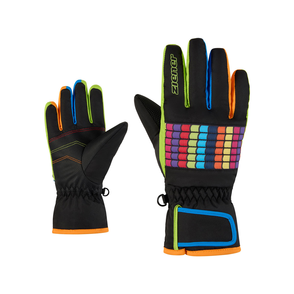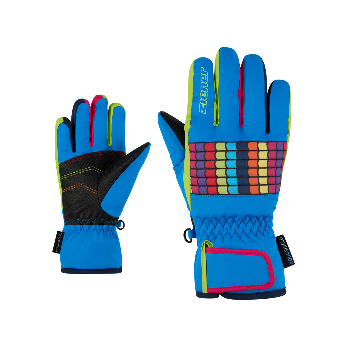 The cool, colorful ZIENER children's ski gloves LAMIL-Z AS® JUNIOR are equipped with a waterproof and windproof ZIENER AQUASHIELD® membrane, which ensures a dry climate and wearing comfort. The soft and warm padding keeps hands pleasantly warm during winter sports activities. The cuff can be adjusted with a Velcro fastener and worn over or under the sleeve. The outer fabric is bluesign® and Standard 100 by OEKO-TEX® certified.