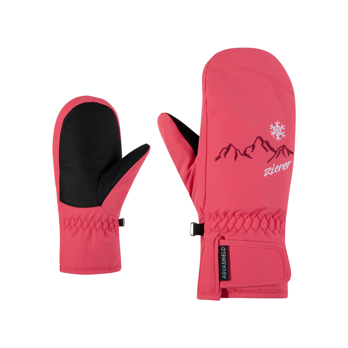 The trendy ZIENER LAILLANI-Z AS® MITTEN GIRLS ski mittens for girls impress with their fashionable embroidery on the back of the hand. The waterproof and windproof ZIENER AQUASHIELD® membrane also ensures a warm and dry climate. The wide Velcro strap allows the glove to be worn over or under the jacket. The outer fabric is bluesign® and Standard 100 by OEKO-TEX® certified.