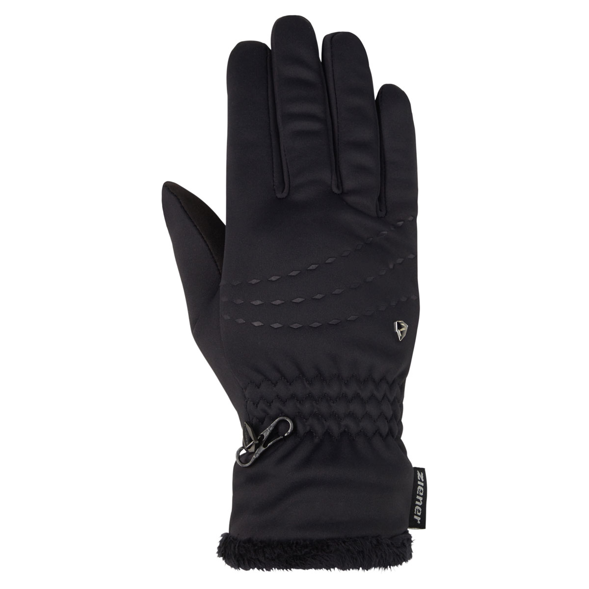 The classic ZIENER INDIRI-Z WS TOUCH LADY leisure gloves made from softshell material are equipped with a soft and warm plush lining, which is also visible on the cuff. They also feature GORE® WINDSTOPPER® product technology and are completely windproof and breathable. Additional reinforcement of the palm with a leather patch ensures perfect robustness and outstanding grip. With the integrated TOUCH function, touchscreens can be operated without having to remove the gloves. The elastic band ensures a comfortable fit and a good grip on the wrist. The product contains non-textile parts of animal origin.