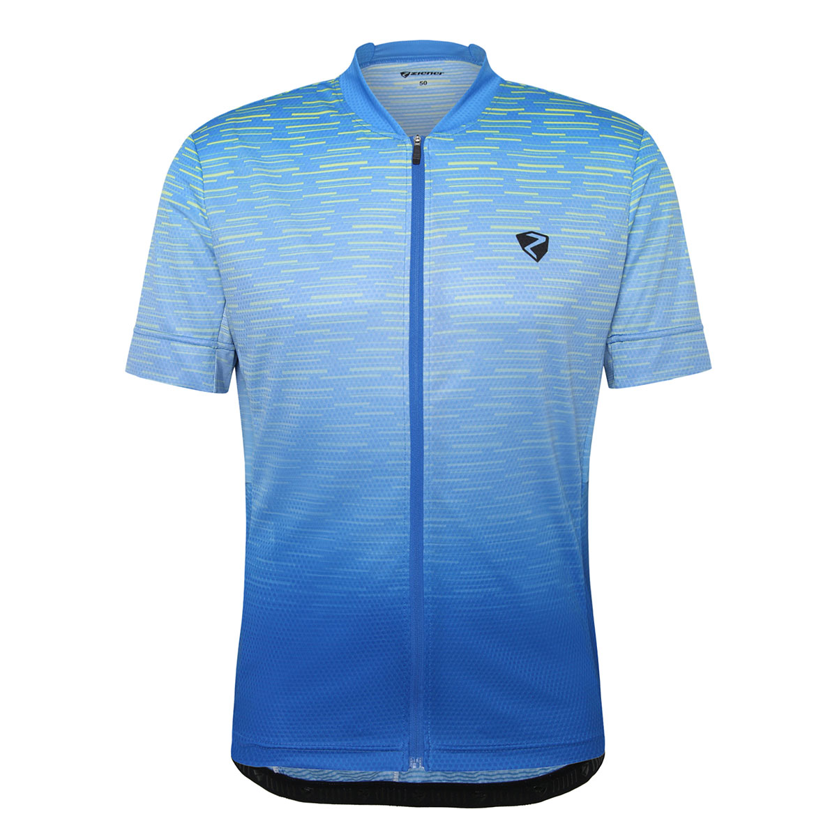 Das funktionelle ZIENER Herren Fahrradtrikot NELETE-Z MAN mit durchgehendem Front-Reißverschluss besitzt Mesh-Einsätze an den Seiten und unter den Ärmeln für optimale Belüftung. Die Silikonbeschichtung am Saum sorgt für perfekten Halt und der schnelltrocknende, elastische Stoff für höchste Performance. Die 3er Rückentasche und eine Reißverschlusstasche bieten genügend Platz für persönliche Utensilien. Der modische Allover-Sublimationsdruck sorgt für Style auf dem Bike.